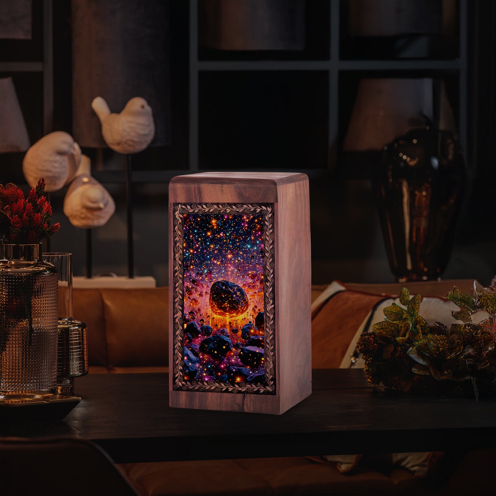 Expertly crafted from premium rosewood, this rosewood urn features a unique asteroids themed design that symbolizes the vastness of the universe and the eternal bond we share with those we love. Each piece is handmade wooden craftsmanship, carefully polished to highlight the natural warmth and durability of the wood. The elegant rosewood urn box structure provides both beauty and security, making it ideal for memorial display or burial. Designed as one of the finest wooden urns for human ashes adult male, this memorial box combines artistic design with the strength and reliability expected from high-quality wooden urns for human ashes adult man.