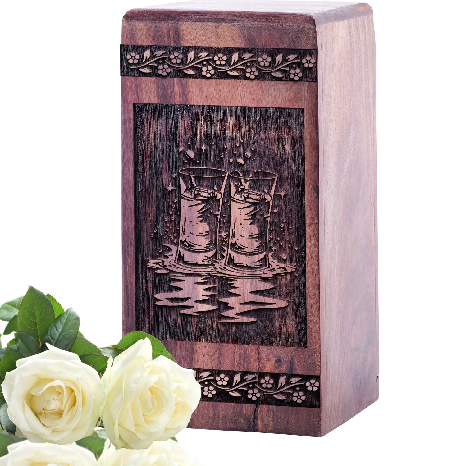 This distinctive Wood Cremation Urn serves as a lasting toast to a life filled with love and happiness.