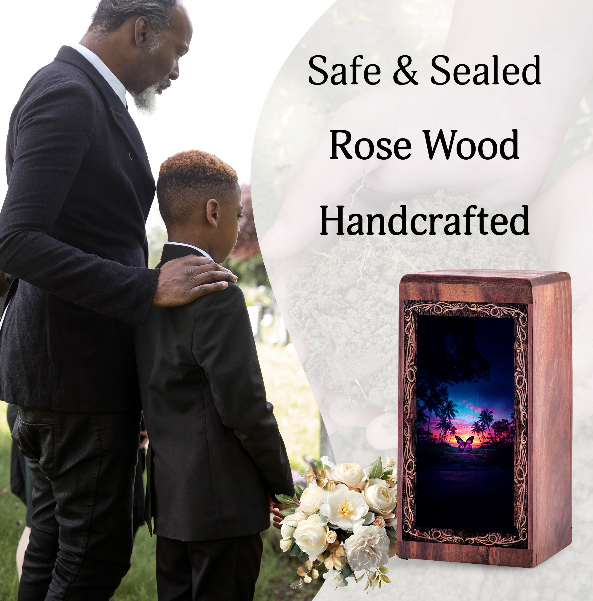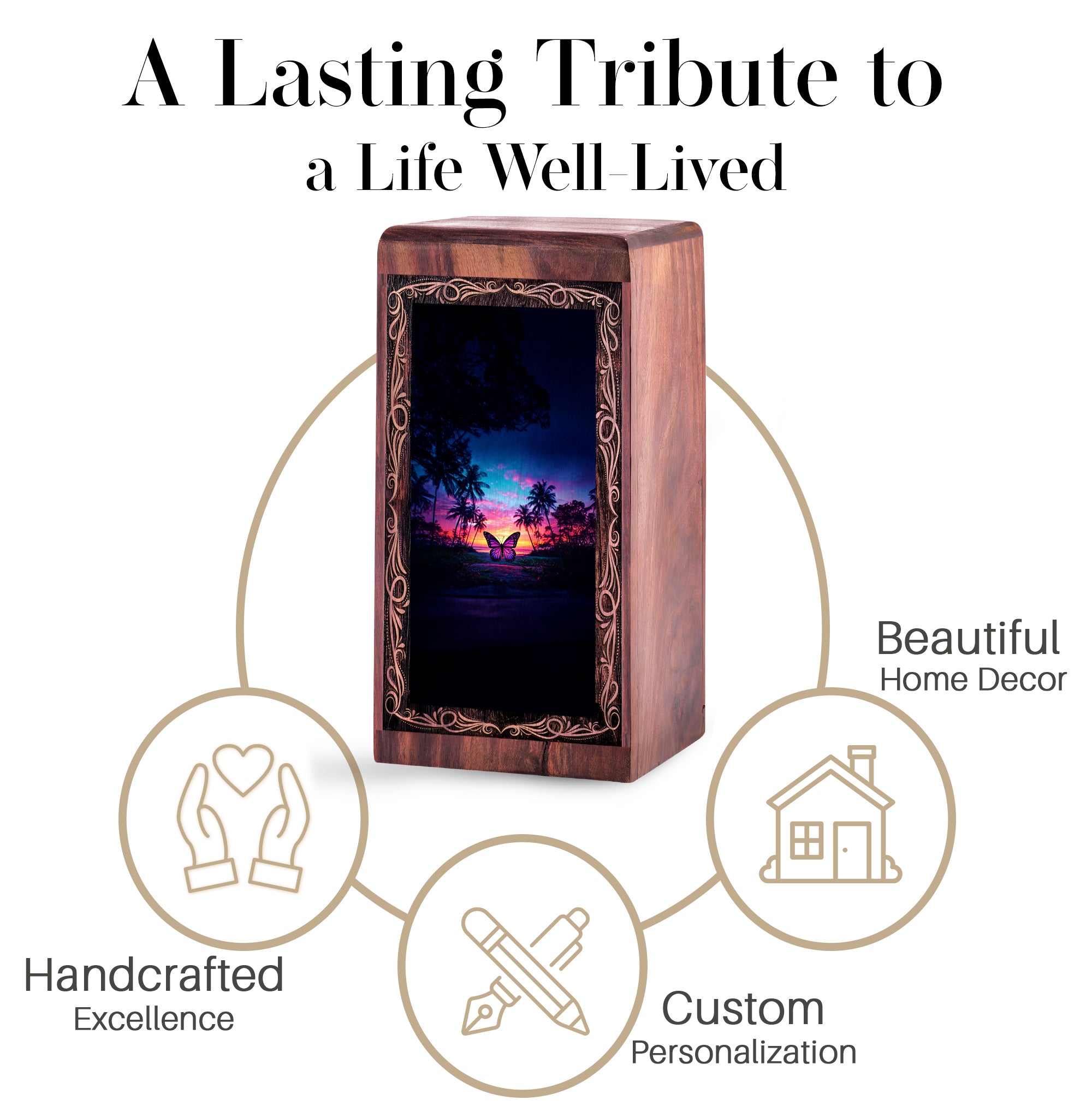 Expertly crafted, this handmade wood urn box blends artistic elegance with lasting durability. The soothing beach night scene combined with delicate butterfly details creates a calming visual, making it a perfect cremation urn wooden box for both display and burial. This wood cremation urn for human ashes is thoughtfully designed to function as a wood box urn for ashes, offering both practicality and elegance. Its smooth finish and sturdy structure make it one of the finest wood funeral urns, suitable as a wood cremation urn for adult use or even as a wood pet urn for smaller keepsake needs. The versatile design allows it to serve as a wood urn box, cremation urn wood, or wood boxes for shared remembrance.