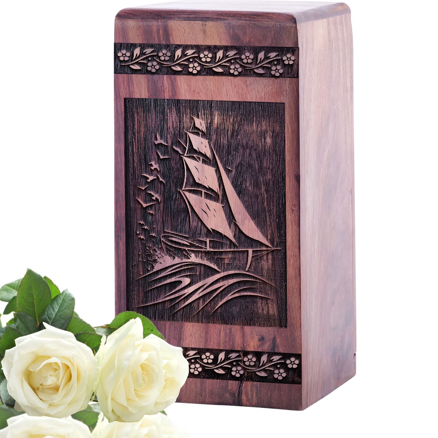 Honor the adventurous spirit of your loved one with the Handcrafted Sailboat Wooden Urn for Ashes. Featuring a beautifully carved sailboat, this Wood Cremation Urn symbolizes freedom, peace, and an eternal journey, offering a meaningful tribute.