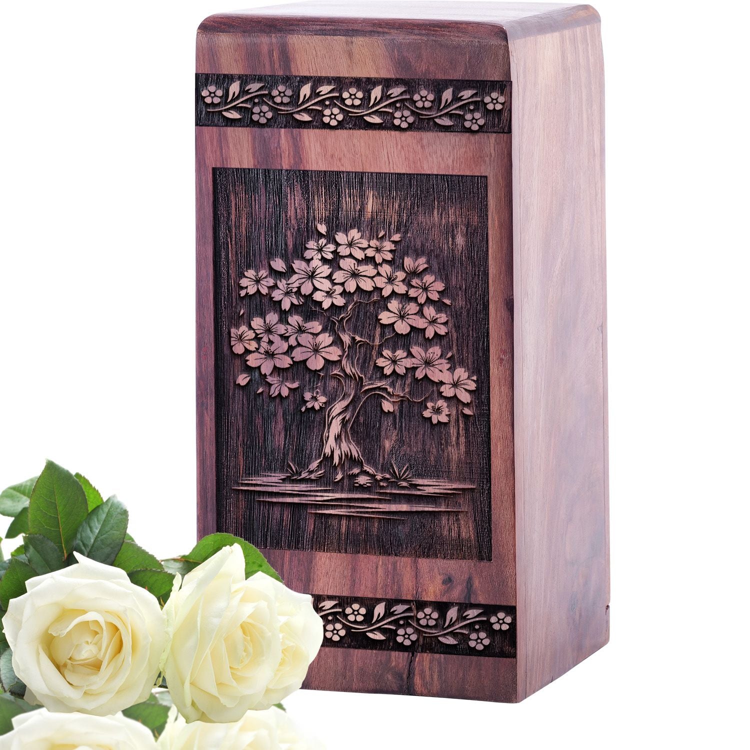 Decorative Wooden Urn with Cherry Blossoms for Human Burial Ashes