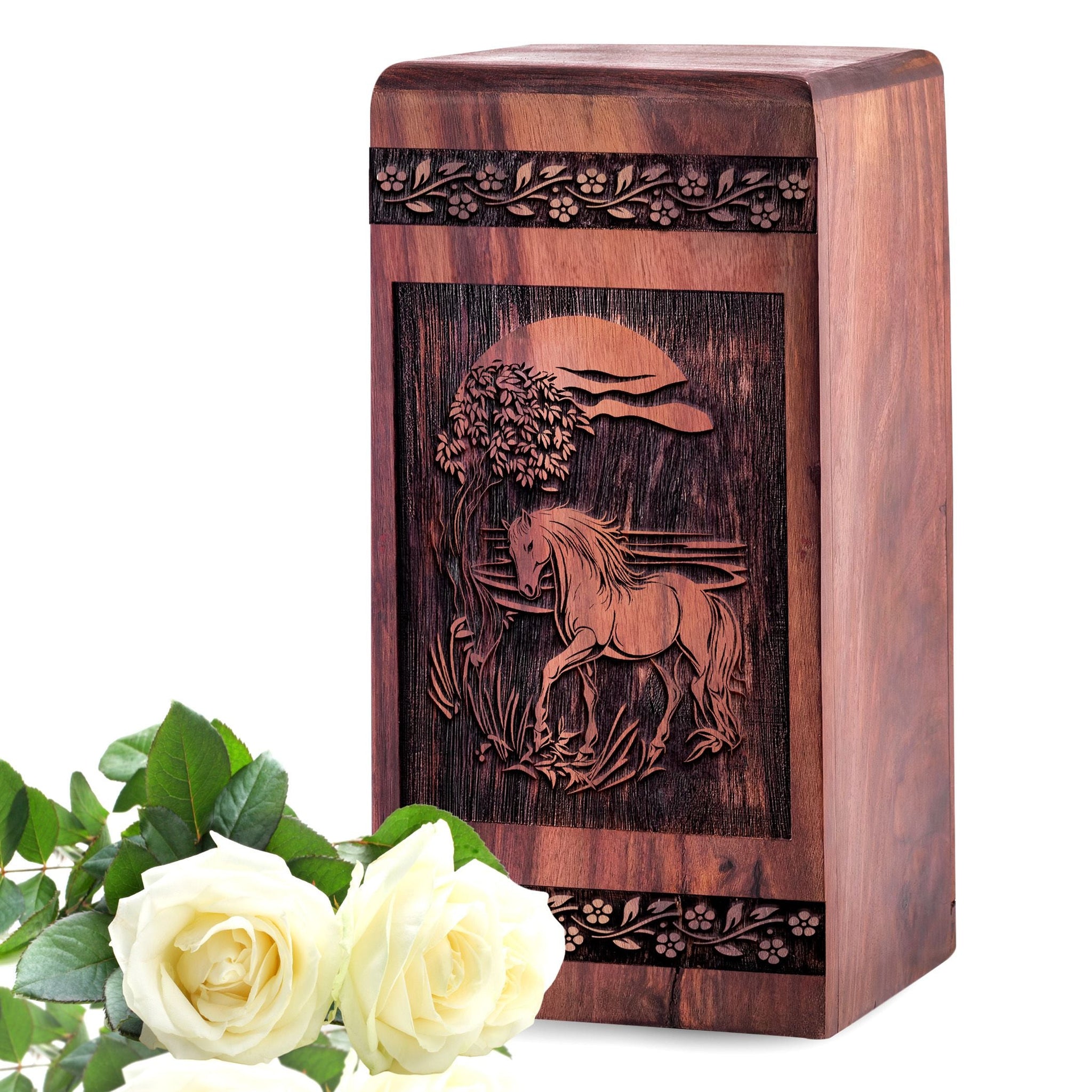 The Silver Stallion Horse Urn celebrates a life of power and grace. Featuring a striking silver horse rearing on its hind legs, this urn symbolizes strength, courage, and the eternal memory of a soul who inspired awe and admiration.