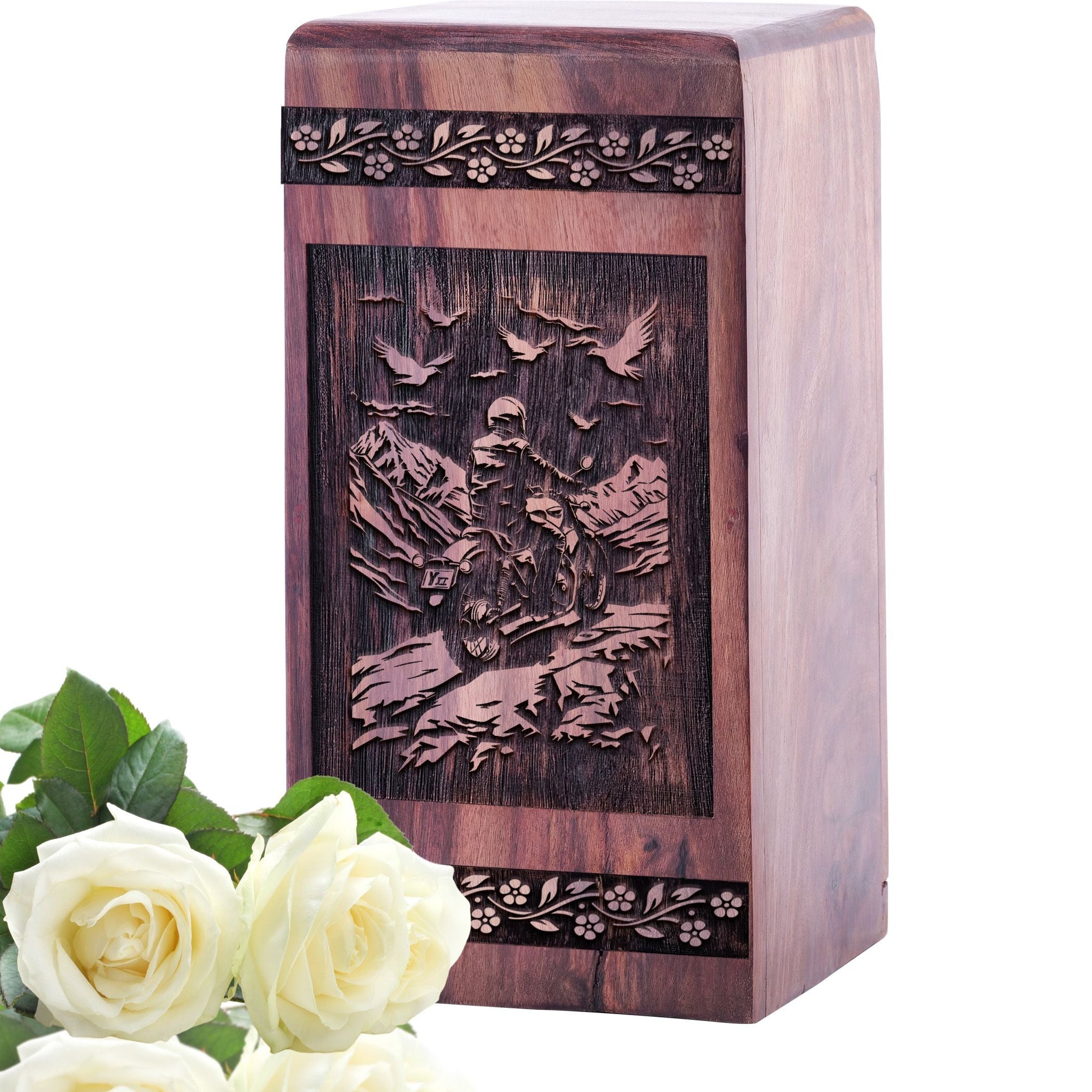 Handcrafted from premium eco-friendly wood, this urn is designed to be both sustainable and durable. Its natural wooden finish is adorned with intricate engravings of a Royal Enfield motorcycle and winding roads, symbolizing the eternal journey of life and love. Whether displayed at home or used for burial, the Royal Enfield Wooden Box Urn serves as a timeless memorial to their legacy.