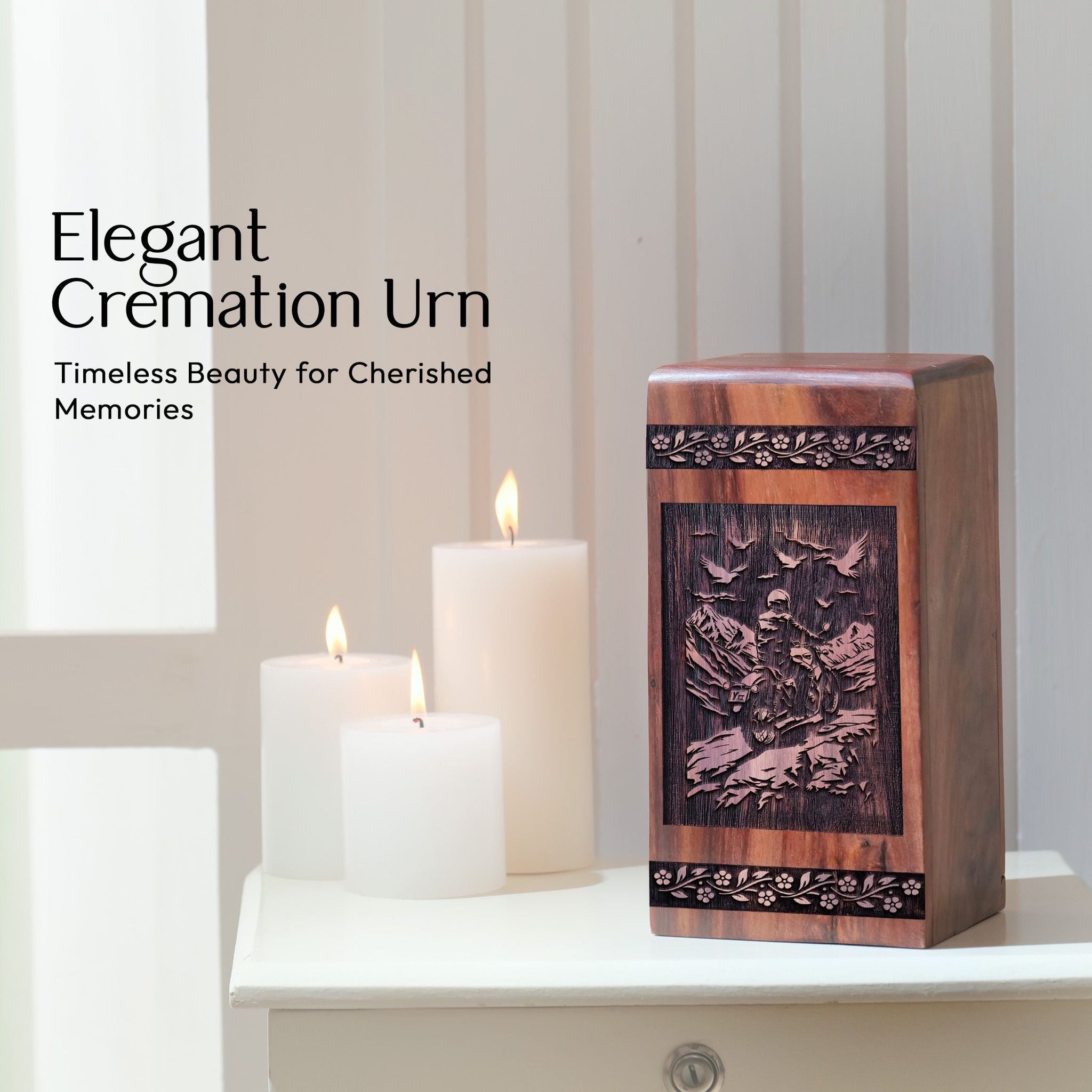 The Royal Enfield Wooden Cremation Urn celebrates a legacy of freedom, exploration, and adventure. Honor their love for the road with a meaningful and artistic tribute that preserves their memory with grace and respect.