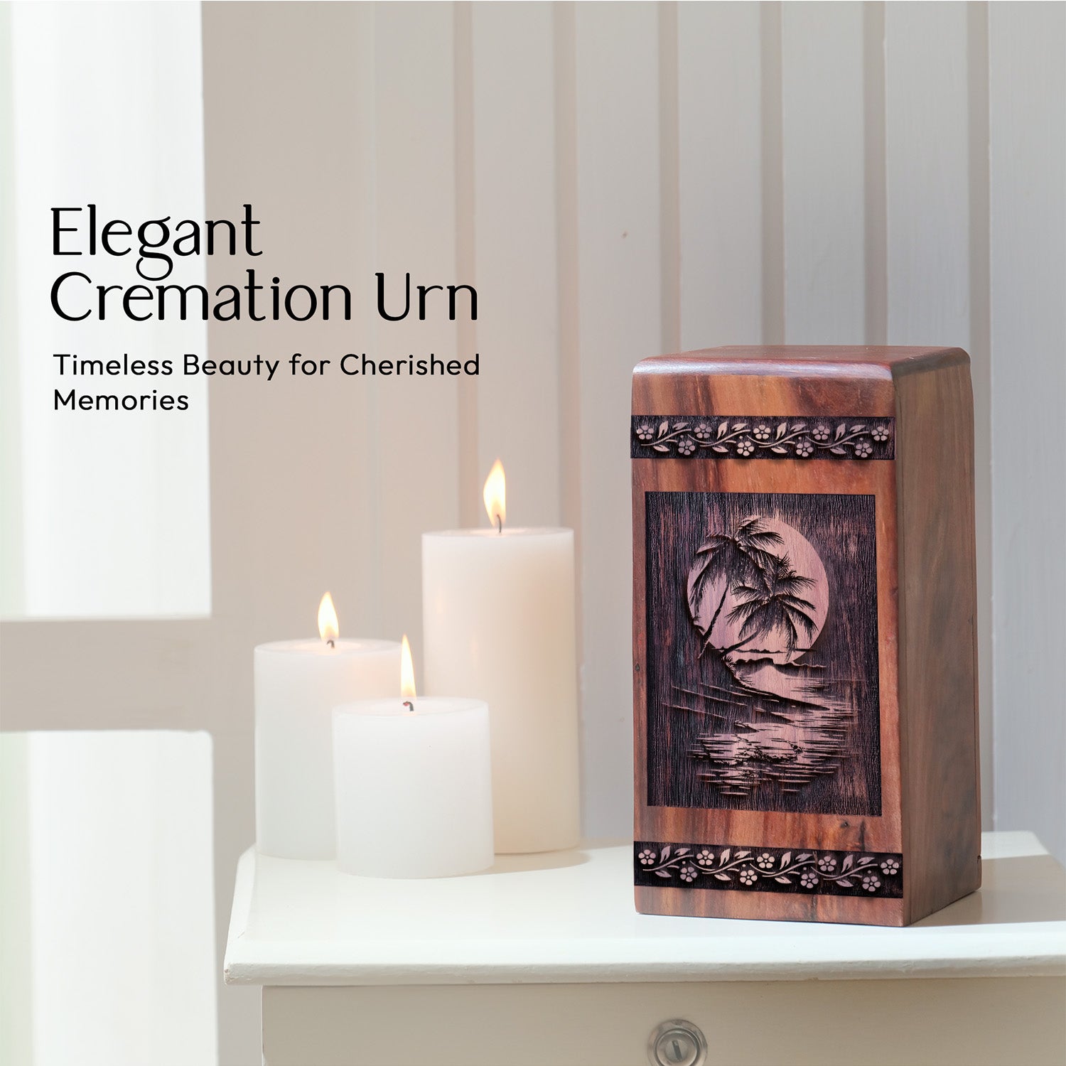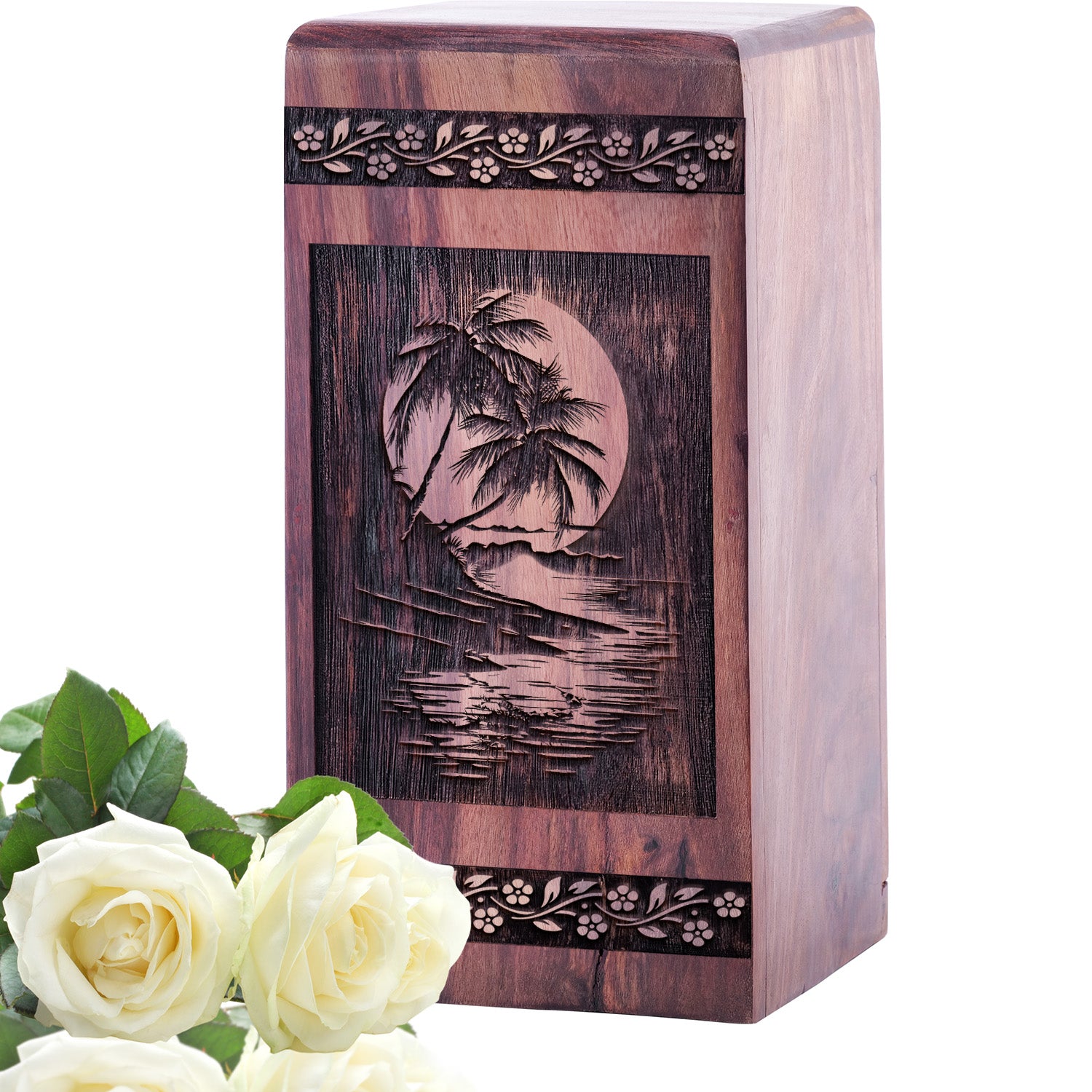 Celebrate the legacy of your loved one with the Handcrafted Sunset Beach Wooden Cremation Urn. Featuring a serene sunset beach Wood Box, this exquisite Wood Cremation Urn symbolizes eternal peace, tranquility, and reflection.