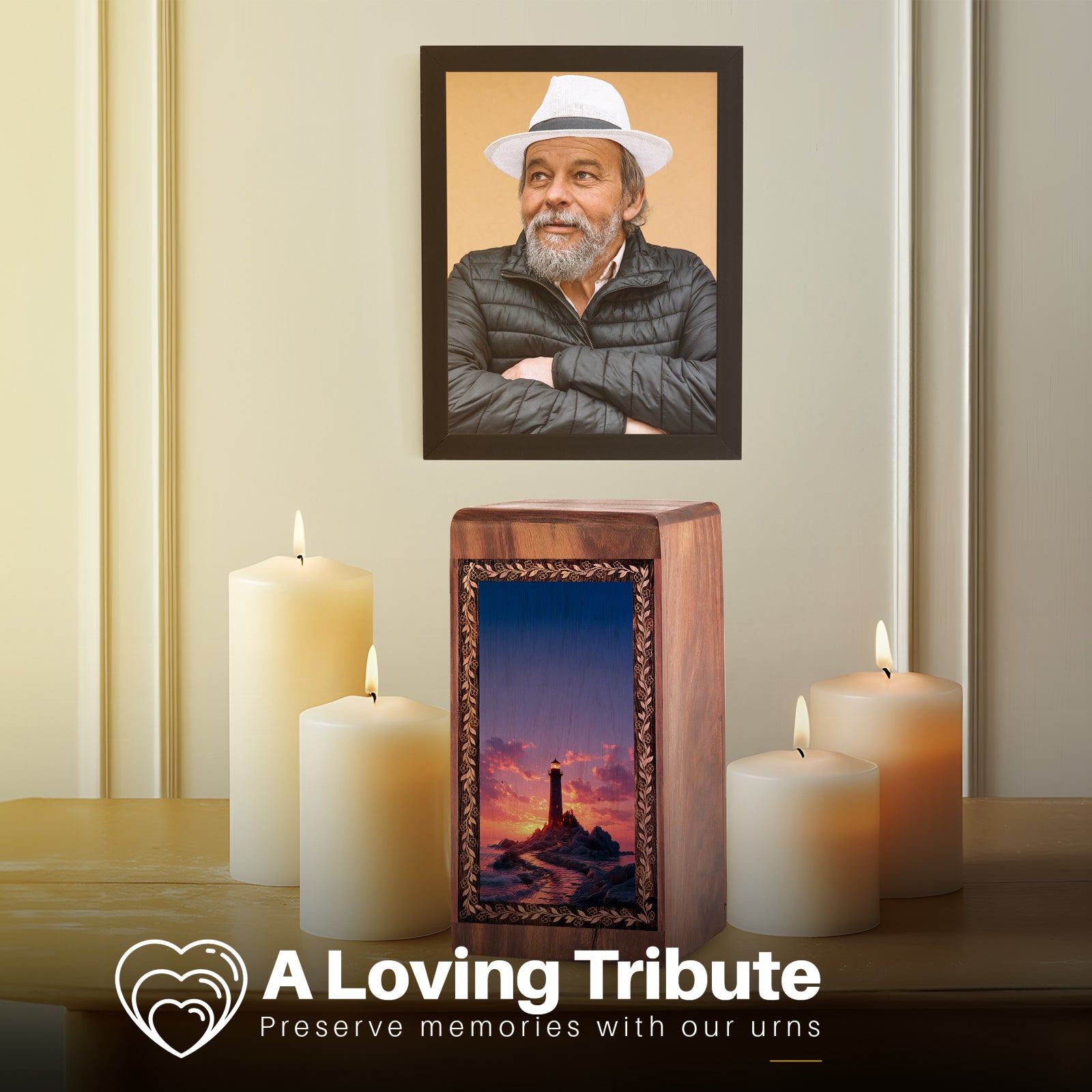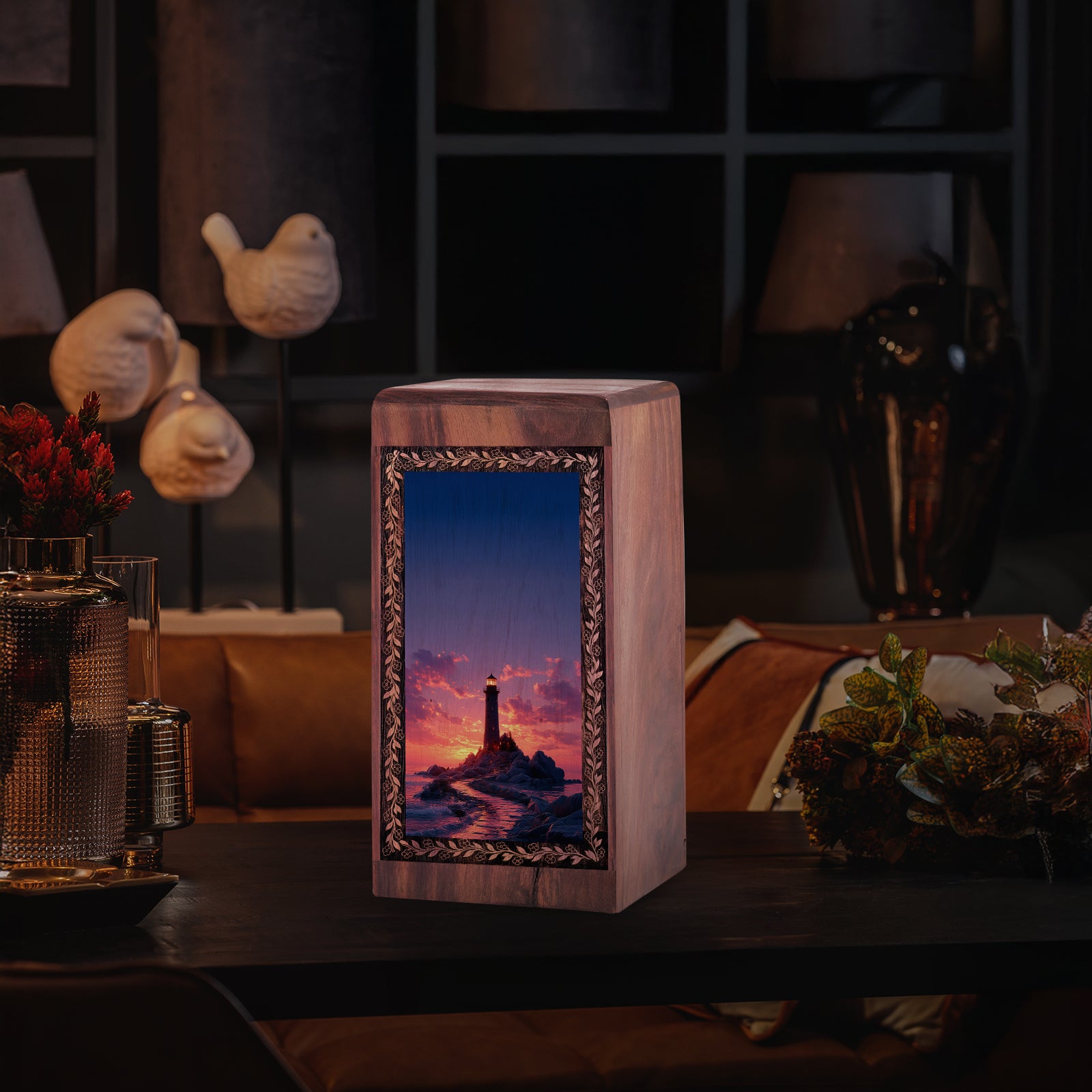 The lighthouse standing against ocean rocks symbolizes protection, endurance, and eternal remembrance. As a beautifully crafted wooden urn box, it serves as a heartfelt symbol of love and memory, offering comfort and honoring a life that will always be cherished.