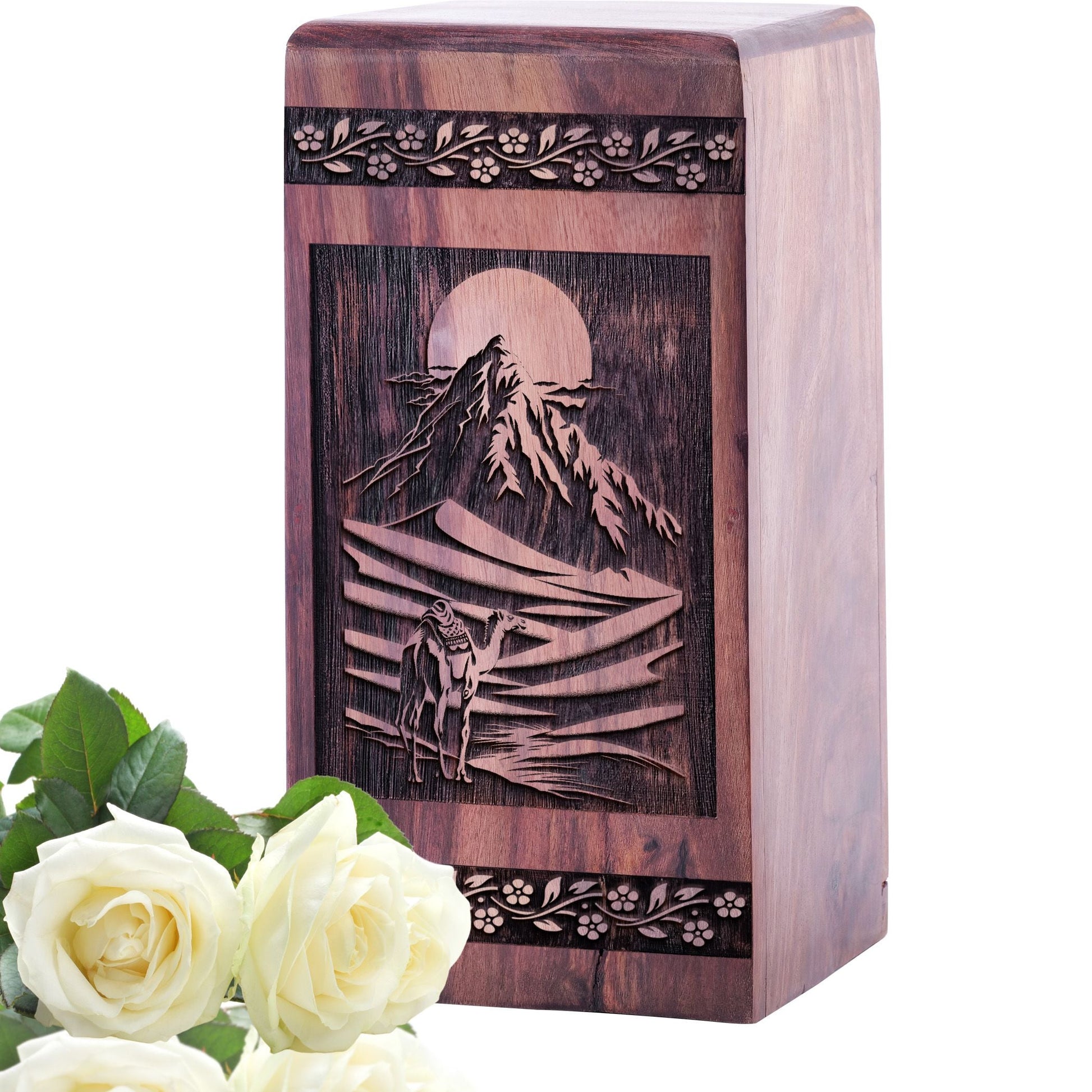 Honor the enduring legacy of your loved one with the Handcrafted Camel in Desert Wooden Urn for Ashes. Featuring a peaceful camel Urn set in a desert landscape, this Wood Cremation Urn symbolizes strength, calm, and the unending expanse of cherished memories.