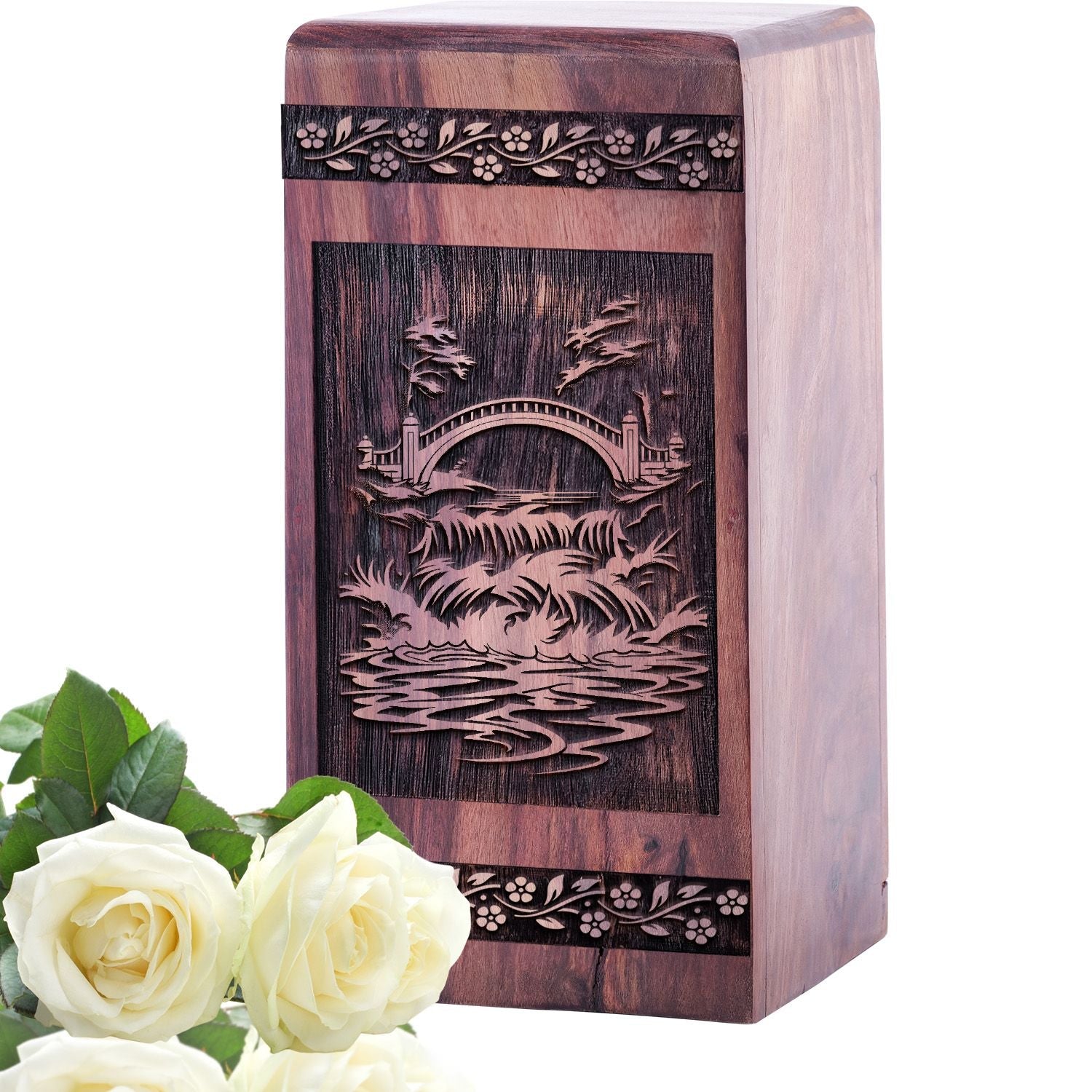 Unique Wooden Cremation Urn with Bridge on River Urn